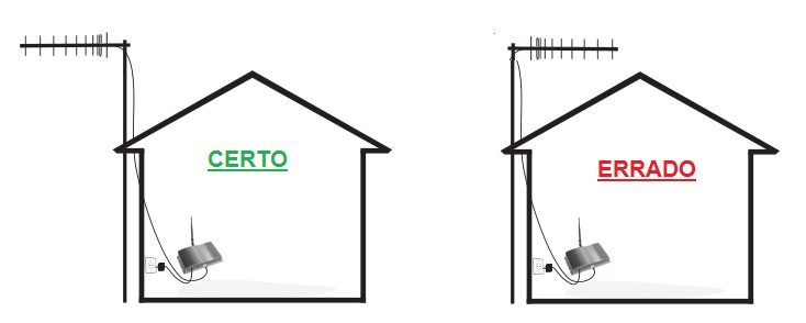 E tem que posicionar de modo que a antena externa fique de costas pro repetidor. Antena no alto, repetidor em baixo, mas não reto pra baixo porque antena tem emissão espúria pra todo lado, tem que colocar de modo que a antena interna fique "isolada" da externa com uns 20dBm de isolamento entre elas, pra evitar feedback (Realimentação). Seria digamos isso: