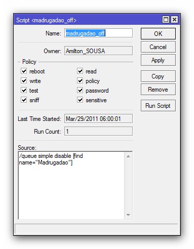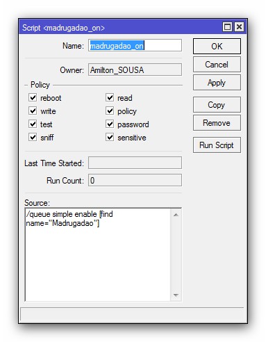 A partir dai já estaria funcionando perfeitamente na hora marcada que seria 00:01 até as 07:00, mas como disse estaria, porq pra quem usa hotspot a partir do momento que alguem logar seu controle de banda na queue vai esta acima de nossa queue " Madrugadao" depois de varias pesquisas e testes aqui na minha RB 450G com a versão 5.2 funcionou quando eu criei um Script pra mover a queue "Madrugadao" sempre para a posição 0 ( Ai sim funcionou perfeitamente ) vamos deixar de enrolação e vá até System Script e adicione um Script como no de "Subir Queue" e em source coloque: