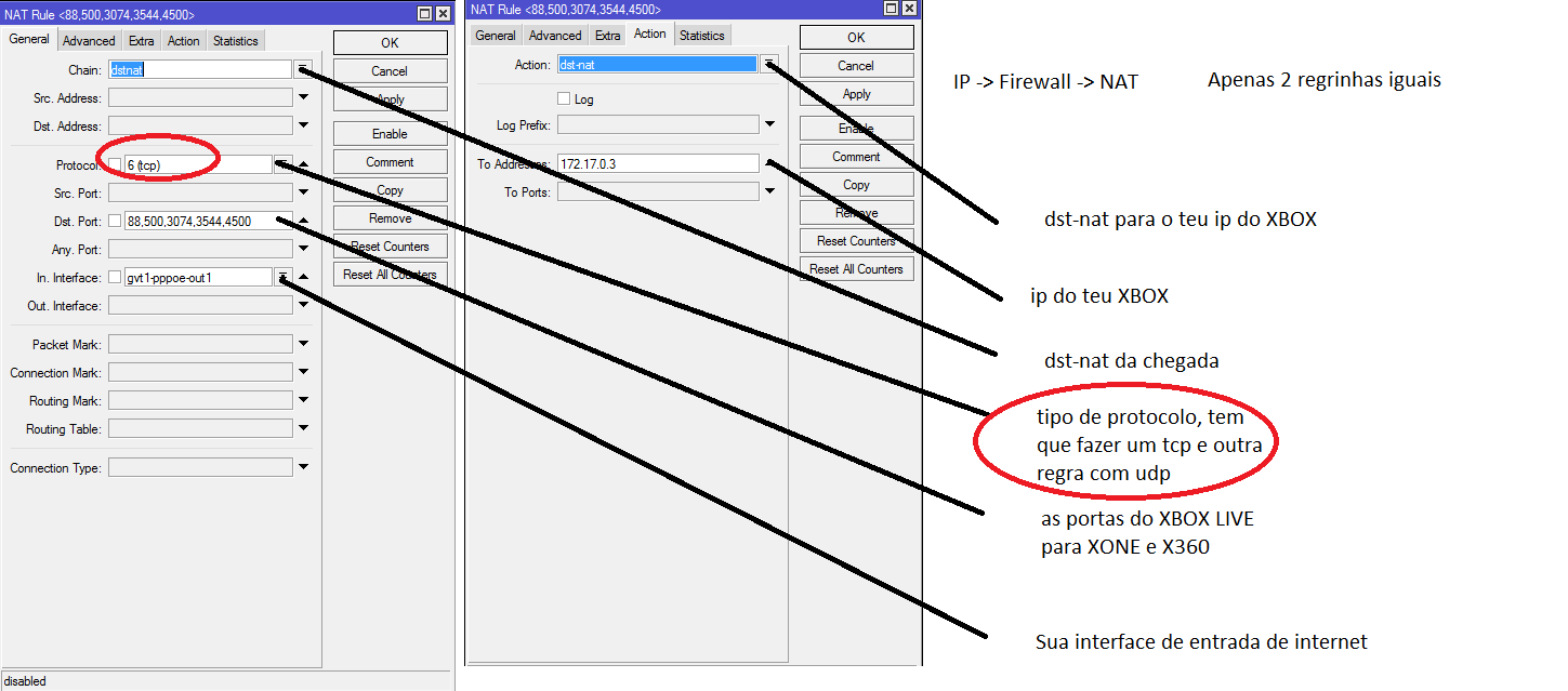 Pessoal sempre tive problema com portas no mk, aproveitando o tópico. O meu provedor agora é somente pppoe, então tem uns 4 clientes que querem usar o xbox. Como posso fazer essa regra para passar?