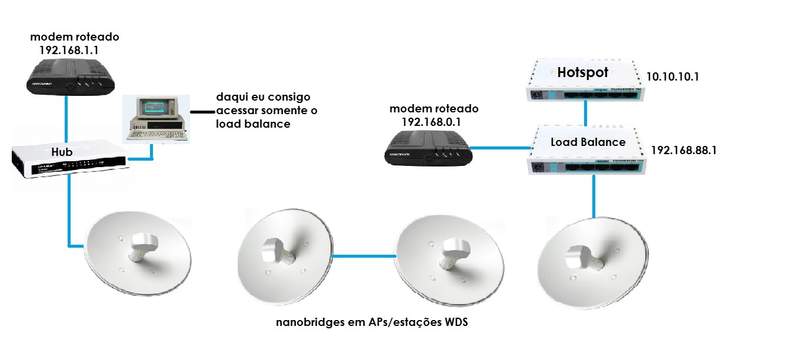 Na imagem que eu anexei no post anterior mosta um pc conectado no hub. Dali consigo acessar o LB pelo ip 192.168.1.2, cujo o qual foi o ip que atribui na eth1 do LB, na eth saida do LB ta com ip 192.168.88.1 que entra no meu hotspot, que esta como dhcp cliente e ip de saida 10.10.10.1 .Oque eu gostaria e de pelo menos conseguir acessar a rb que roda o hotspot desse pc que ta ligado no hub da imagen. Ja tentei redirecionamento mais não obtive exito.