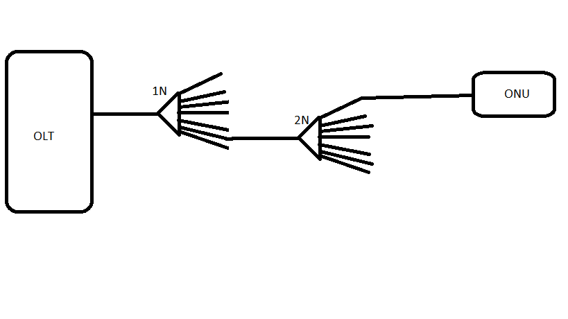 Para cada porta PON da OLT vc tem 1 Splitter de 1 nível, para cada saída de um Splitter de 1 Nível vc tem 1 splitter de 2 Nível, e para cada saída de cada splitter de 2 Nível vc tem uma ONU de cliente.