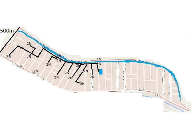 Anexo 57617 @marcioelias recorri ao paint tbm rsrs. Este é o mata do bairro a olt é esse quadrado azul e a linha azul seria a fibra principal que penso em derivar para as ruas transversais e então fazer a distribuição para as casas