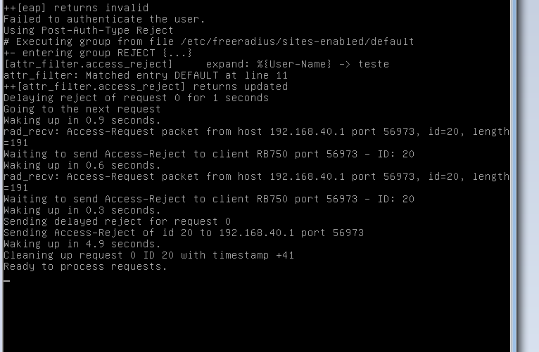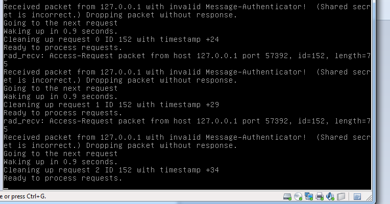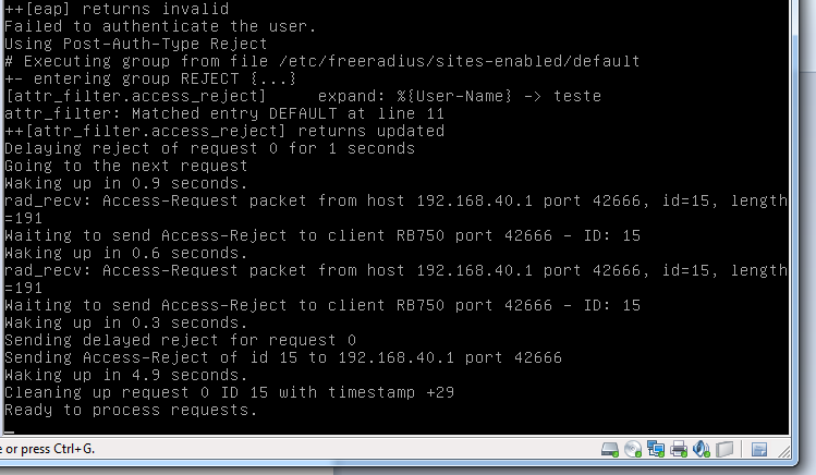 Quando faço o teste como "radtest" fica repetindo essa mensagem o tempo todo, o certo seria apareçer no final