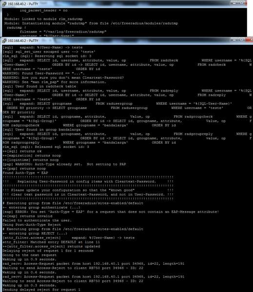 Código :rad_recv: Access-Request packet from host 192.168.40.1 port 40085, id=24, length=191 NAS-Port-Type = Wireless-802.11 Calling-Station-Id = "80:EE:73:1B:CD:CC" Called-Station-Id = "hotspot1" NAS-Port-Id = "teste" User-Name = "teste" NAS-Port = 2147483669 Acct-Session-Id = "80000015" Framed-IP-Address = 10.0.5.254 Mikrotik-Host-IP = 10.0.5.254 CHAP-Challenge = 0x1a07368e7ad9033c2c3afc83f78eab52 CHAP-Password = 0x66af1b7658d5787074736308e564e3900b Service-Type = Login-User WISPr-Logoff-URL = "http://10.0.5.1/logout" NAS-Identifier = "jatonet" NAS-IP-Address = 192.168.40.1 # Executing section authorize from file /etc/freeradius/sites-enabled/default +- entering group authorize {...} ++[preprocess] returns ok [chap] Setting 'Auth-Type := CHAP' ++[chap] returns ok ++[mschap] returns noop ++[digest] returns noop [suffix] No '@' in User-Name = "teste", looking up realm NULL [suffix] No such realm "NULL" ++[suffix] returns noop [eap] No EAP-Message, not doing EAP ++[eap] returns noop ++[files] returns noop [sql] expand: %{User-Name} -> teste [sql] sql_set_user escaped user --> 'teste' rlm_sql (sql): Reserving sql socket id: 4 [sql] expand: SELECT id, username, attribute, value, op FROM radcheck WHERE username = '%{SQL-User-Name}' ORDER BY id -> SELECT id, username, attribute, value, op FROM radcheck WHERE username = 'teste' ORDER BY id WARNING: Found User-Password == "...". WARNING: Are you sure you don't mean Cleartext-Password? WARNING: See "man rlm_pap" for more information. [sql] User found in radcheck table [sql] expand: SELECT id, username, attribute, value, op FROM radreply WHERE username = '%{SQL-User-Name}' ORDER BY id -> SELECT id, username, attribute, value, op FROM radreply WHERE username = 'teste' ORDER BY id [sql] expand: SELECT groupname FROM radusergroup WHERE username = '%{SQL-User-Name}' ORDER BY priority -> SELECT groupname FROM radusergroup WHERE username = 'teste' ORDER BY priority [sql] expand: SELECT id, groupname, attribute, Value, op FROM radgroupcheck WHERE groupname = '%{Sql-Group}' ORDER BY id -> SELECT id, groupname, attribute, Value, op FROM radgroupcheck WHERE groupname = 'bandalarga' ORDER BY id [sql] User found in group bandalarga [sql] expand: SELECT id, groupname, attribute, value, op FROM radgroupreply WHERE groupname = '%{Sql-Group}' ORDER BY id -> SELECT id, groupname, attribute, value, op FROM radgroupreply WHERE groupname = 'bandalarga' ORDER BY id rlm_sql (sql): Released sql socket id: 4 ++[sql] returns ok ++[expiration] returns noop ++[logintime] returns noop [pap] WARNING: Auth-Type already set. Not setting to PAP ++[pap] returns noop Found Auth-Type = PAP !!!!!!!!!!!!!!!!!!!!!!!!!!!!!!!!!!!!!!!!!!!!!!!!!!!!!!!!!!!!!!!!!!!!!!!!!!!!!!! !!! Replacing User-Password in config items with Cleartext-Password. !!! !!!!!!!!!!!!!!!!!!!!!!!!!!!!!!!!!!!!!!!!!!!!!!!!!!!!!!!!!!!!!!!!!!!!!!!!!!!!!!! !!! Please update your configuration so that the "known good" !!! !!! clear text password is in Cleartext-Password, and not in User-Password. !!! !!!!!!!!!!!!!!!!!!!!!!!!!!!!!!!!!!!!!!!!!!!!!!!!!!!!!!!!!!!!!!!!!!!!!!!!!!!!!!! # Executing group from file /etc/freeradius/sites-enabled/default +- entering group PAP {...} [pap] ERROR: You set 'Auth-Type = PAP' for a request that does not contain a User-Password attribute! ++[pap] returns invalid Failed to authenticate the user. Using Post-Auth-Type Reject # Executing group from file /etc/freeradius/sites-enabled/default +- entering group REJECT {...} [attr_filter.access_reject] expand: %{User-Name} -> teste attr_filter: Matched entry DEFAULT at line 11 ++[attr_filter.access_reject] returns updated Delaying reject of request 0 for 1 seconds Going to the next request Waking up in 0.9 seconds. rad_recv: Access-Request packet from host 192.168.40.1 port 40085, id=24, length=191 Waiting to send Access-Reject to client RB750 port 40085 - ID: 24 Waking up in 0.6 seconds. rad_recv: Access-Request packet from host 192.168.40.1 port 40085, id=24, length=191 Waiting to send Access-Reject to client RB750 port 40085 - ID: 24 Waking up in 0.3 seconds. Sending delayed reject for request 0 Sending Access-Reject of id 24 to 192.168.40.1 port 40085 Waking up in 4.9 seconds. Cleaning up request 0 ID 24 with timestamp +37 Ready to process requests.