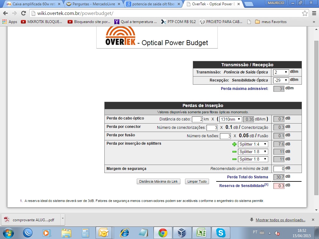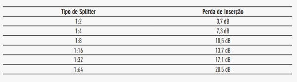 em cada fibra que chega no cliente. Isso sem considerar as perdas por emenda por fusão ou mecânica, além da conectorizada, que vai no splitter da CTO (por isso há uma margem de segurança que é adicionada aos cálculos).