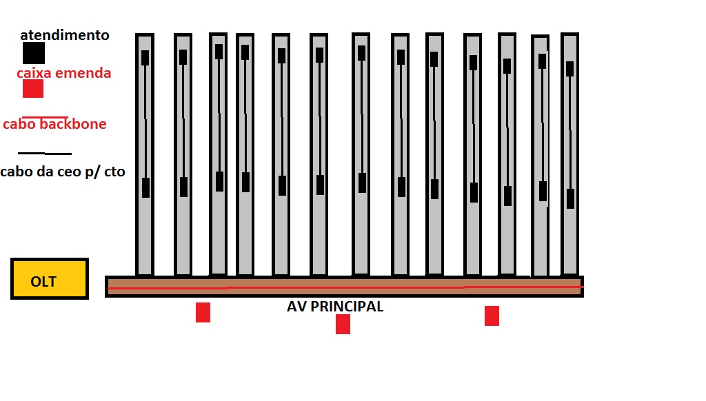 Você divide cada uma dessas 8 fibras iniciais (1 de cada porta PON), em 4. Cada uma dessas 4 você divide em 8. Cada uma dessas 8 fibras você divide novamente em 8, que são as que chegam na ONU do cliente.