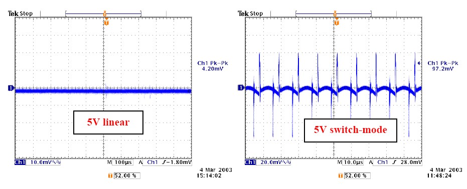 Na esquerda 5V sem ripple, na direita 5V com 97mV de ripple. Tem sempre não apenas a variação rapida mas esses picos esquisitos pra cima de pra baixo, são spikes.
