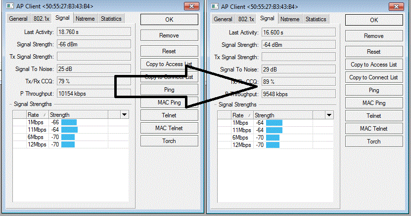 Se for, acho que 15Mbps pra sinal -71 (Sempre olho o pior sinal, ele que é o gargalo) tá muito bom, porque a sensibilidade de 54M é uns -76.