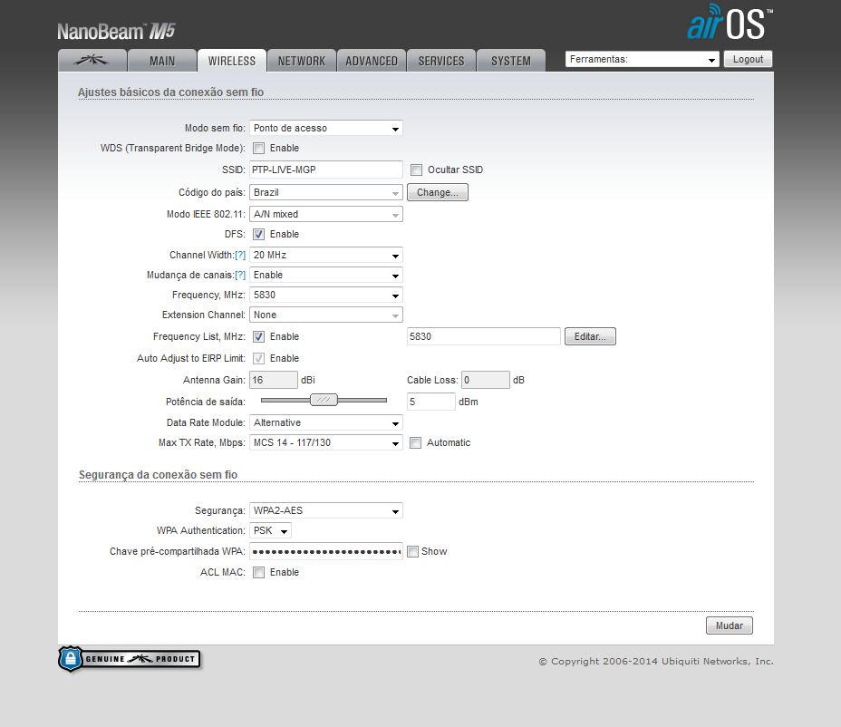 Alterei para 20MHZ, deixei em 5830MHZ, pois é o maximo que aparece.. não me aparece 5725 nem 5850..