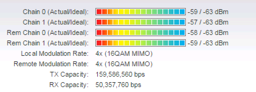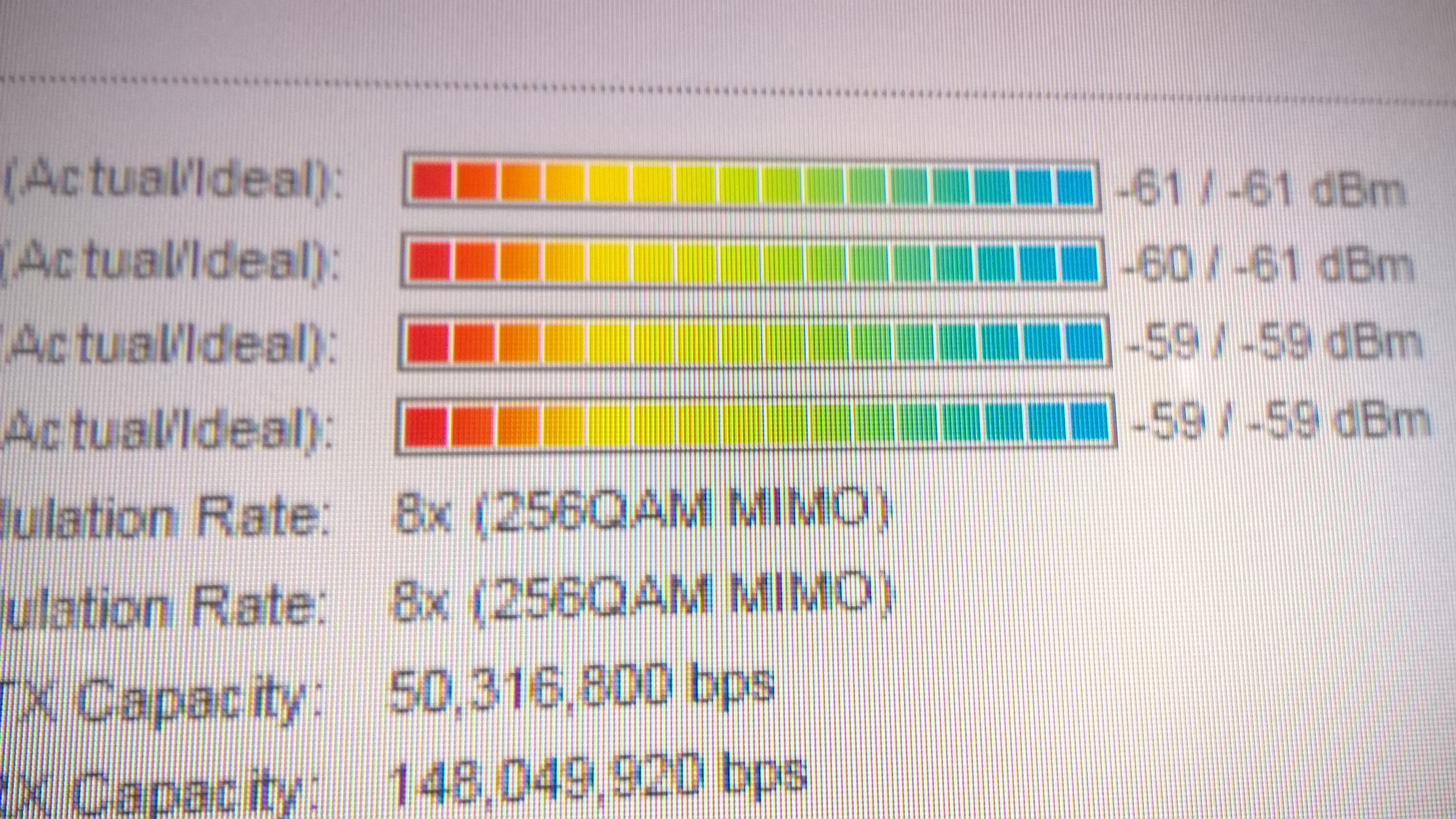 Enfrentei um grande dor de cabeça com esse kit 45° aonde umas das chain o sinal fico em -76 e outra chain -64 apos quase 8hr de alinhamento consegui -71 e -59 ja esta pra voltar as rb912 quando resolvi testar eles com dipolo a 90° problema resolvido fico como a screen a baixo.