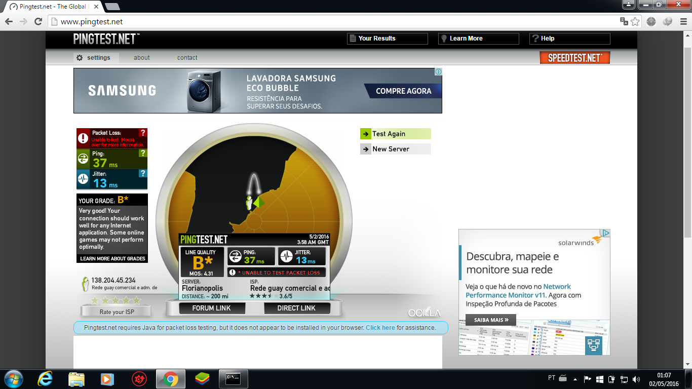 No Speedtest ele encontra servidor a 90ms de mim (A 800-1000km daqui), mas no Pingtest só encontra um server em Florianópolis (2500km daqui, eu acho).