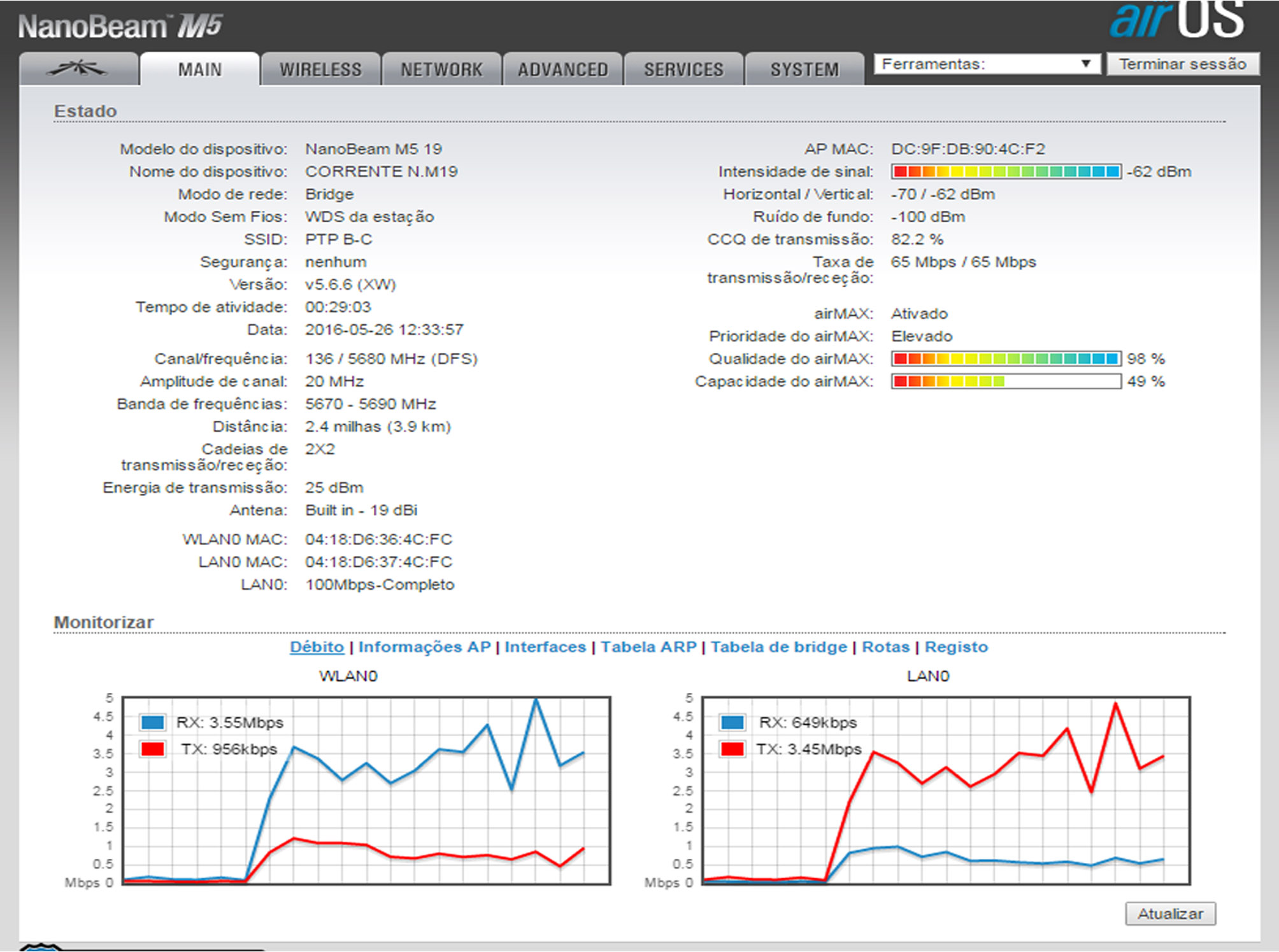 em frequency list mhz deixe apenas o canal que vc esta usando e nao esse tanto marcado, atualize a versao para 5.66, sua LAN0 está dando apenas 10mega, pode ser que o air grid esteja com pau.