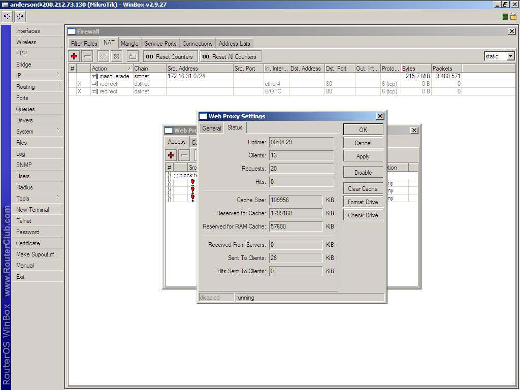 Estou com um problema um pouco estranho. Tenho uma rede com cerca de 60 usuarios, esses usuarios estão misturados entre IP loca e IP valido, toda vez que habilito o Webproxy ele começa contar clientes conectados mesmo sem eu habilitar a rota no NAT.(Imagem anexo)