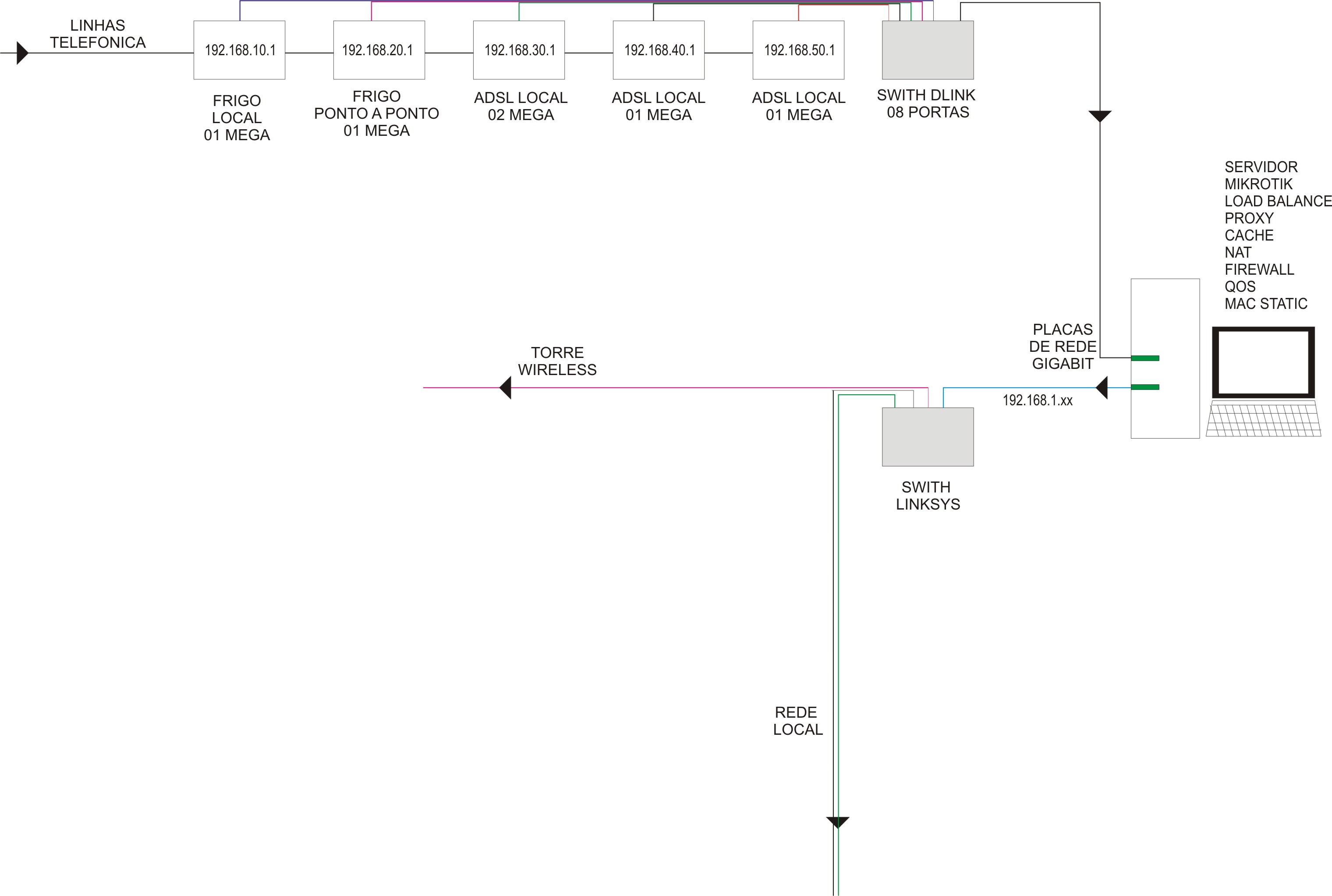 adsl1 (192.168.10.1) + adsl2 (192.168.20.1) + adsl3 (192.168.30.1) ==>>swith 08 portas ==>> entrada servidor MK (((load balance, proxy, cache ))) ===>>> saida pra rede local 192.168.1.xx