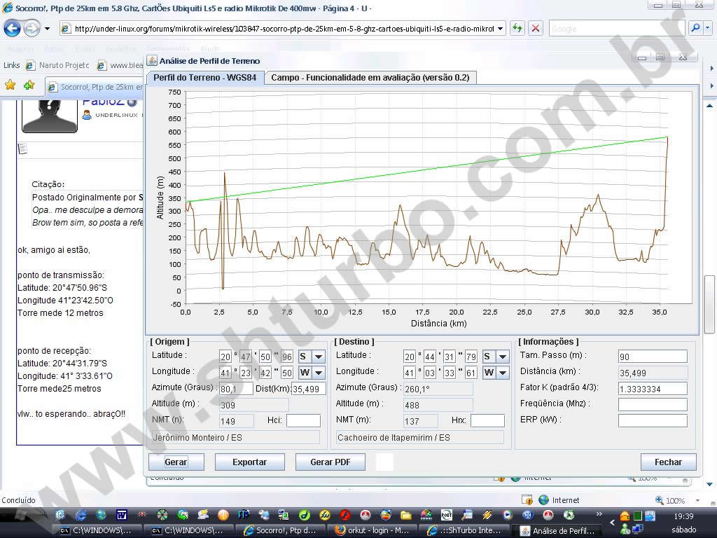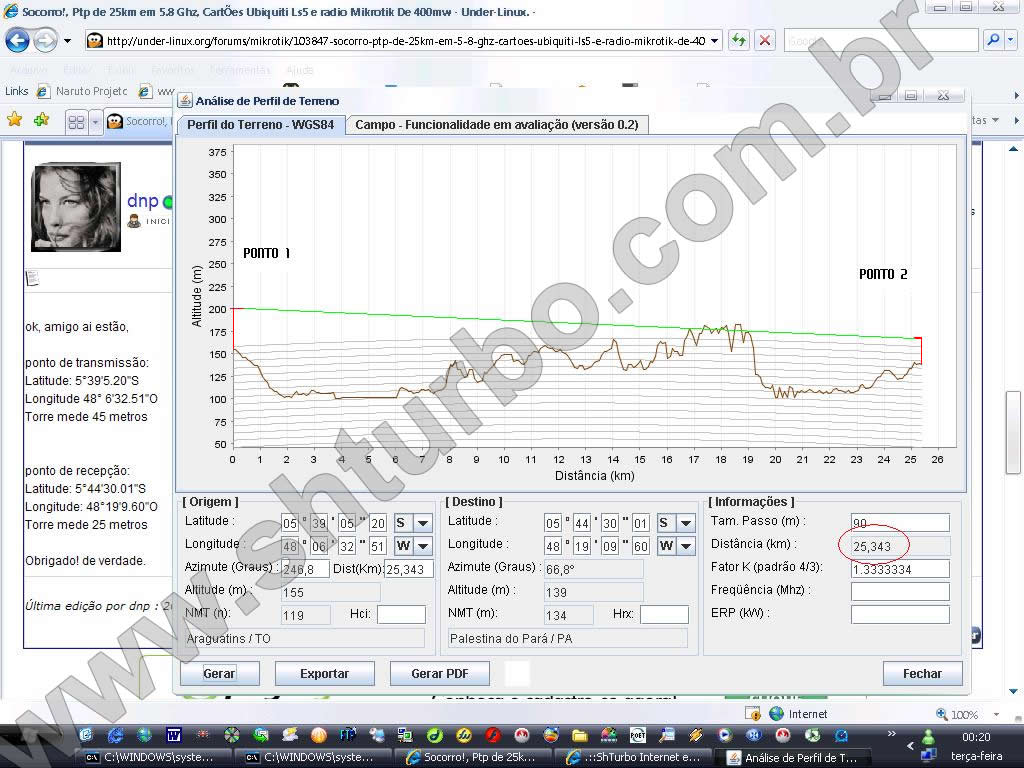 Ola amigos, preciso de ajuda pra fechar essa ptp, bom, será se dar pra fechar? visada limpa considerando a elevações das torres, mas não vejo o outro ponto, pois são 25km!!!, mas a noite dar pra ver o clarão das luzes bem nítido dos pontos relecionados, a primeira torre está à 465 pés de elevação, a segunda está à 550 pés de elevação. Olhando pelo google earth, vejo no meio do caminho há um ponto com 530 pés de elevação, que fica a 7 km da primeira torre. vou usar duas antenas da hyperlink de 29 dbi parabolica, (dúvida eu uso na vertical ou horizontal?), dois radios, um com placa routerbord 133 mikrotik/400mw, e o outro cartão ubiquiti 400mw, ambos em 5.8 ghz (obs: vou passar 1 mb adsl), lembrando que são dois