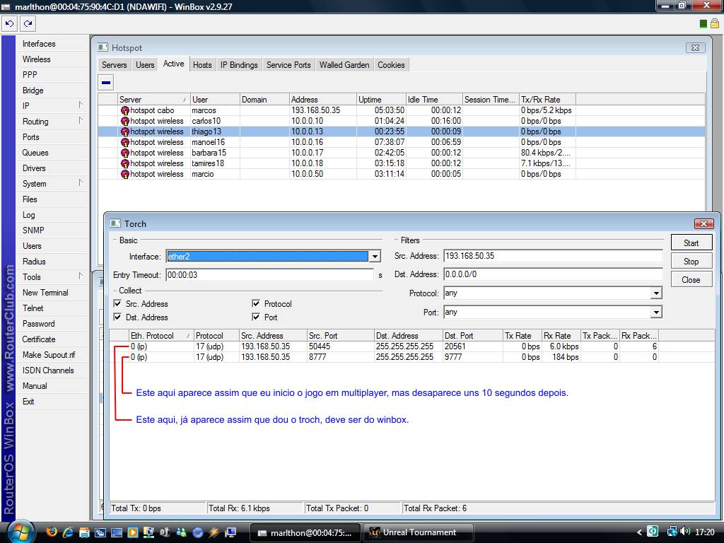 Bom é o seguinte, primeiramente sou fã do Unreal Tournament :-) e tenho clientes que são igualmente fãs, meus clientes tem banda de 100k, então eu queria saber o seguinte, é possível eu liberar o link todo deles apenas para o jogo, e net continua em 100k entenderam? E outra dúvida é a seguinte, eu seria o servidor, meu PC está ligado no servidor Mikrotik por uma placa de rede com faixa de IP 193.168.50.x e meus clientes estão conectados em outra rede com faixa 10.0.0.x eles irão conseguir conectar? tenho que configurar algo?