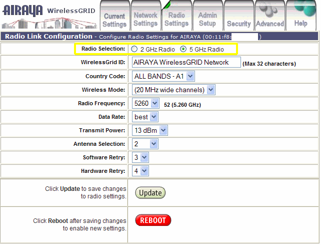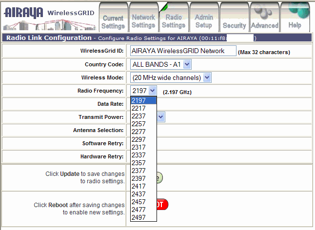 Código :AIRAYA WirelessGRID Ver 1.026. Type (Help) for Command List AIRAYA wlan0 -> admin 0968d894f5b3f61d ca4382c5350497d9 AIRAYA wlan0 -> countrycode Country Code Configuration: Product Model not initialized Country Code not initialized Making changes in this routine will delete the bridge configuration files. Make sure you have saved any configuration information before making changes. Enter y or Y to configure the Product Model: y Choose from the following list: 1 4958-32 2 4958-2 3 4958-PS 4 2225-32 5 2458-124 Enter Model ID Number: 4 Enter y or Y to configure the Country Code: y Choose from the following list: 1 US 2 HongKong 3 ETSI 4 HongKong-EMSD 5 Chile - 1 6 Saudi Arabia 7 All Bands 8 Australia 9 Malaysia 10 Singapore 11 South Africa 12 Brazil Enter Country Code ID Number: 7 Config Files Deleted. Default files will be generated on reboot! AIRAYA wlan0 -> reboot Rebooting AP... Connection to host lost.