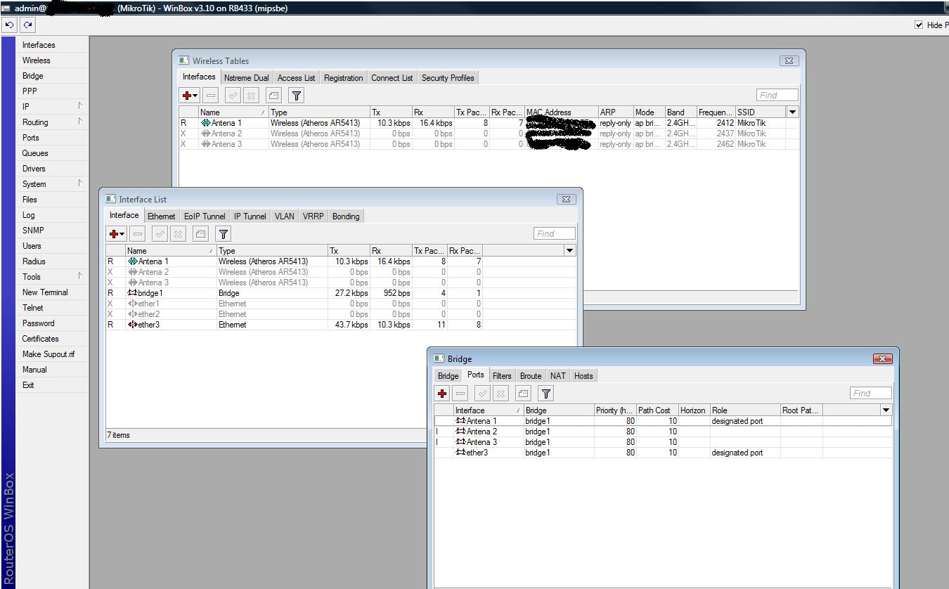 To usando a versão 2.9.27 em baixo e a versão 3.10 em cima. No mk de cima tem uma RB 433AH com 3 cartões engenius que serão ligados nas antenas.