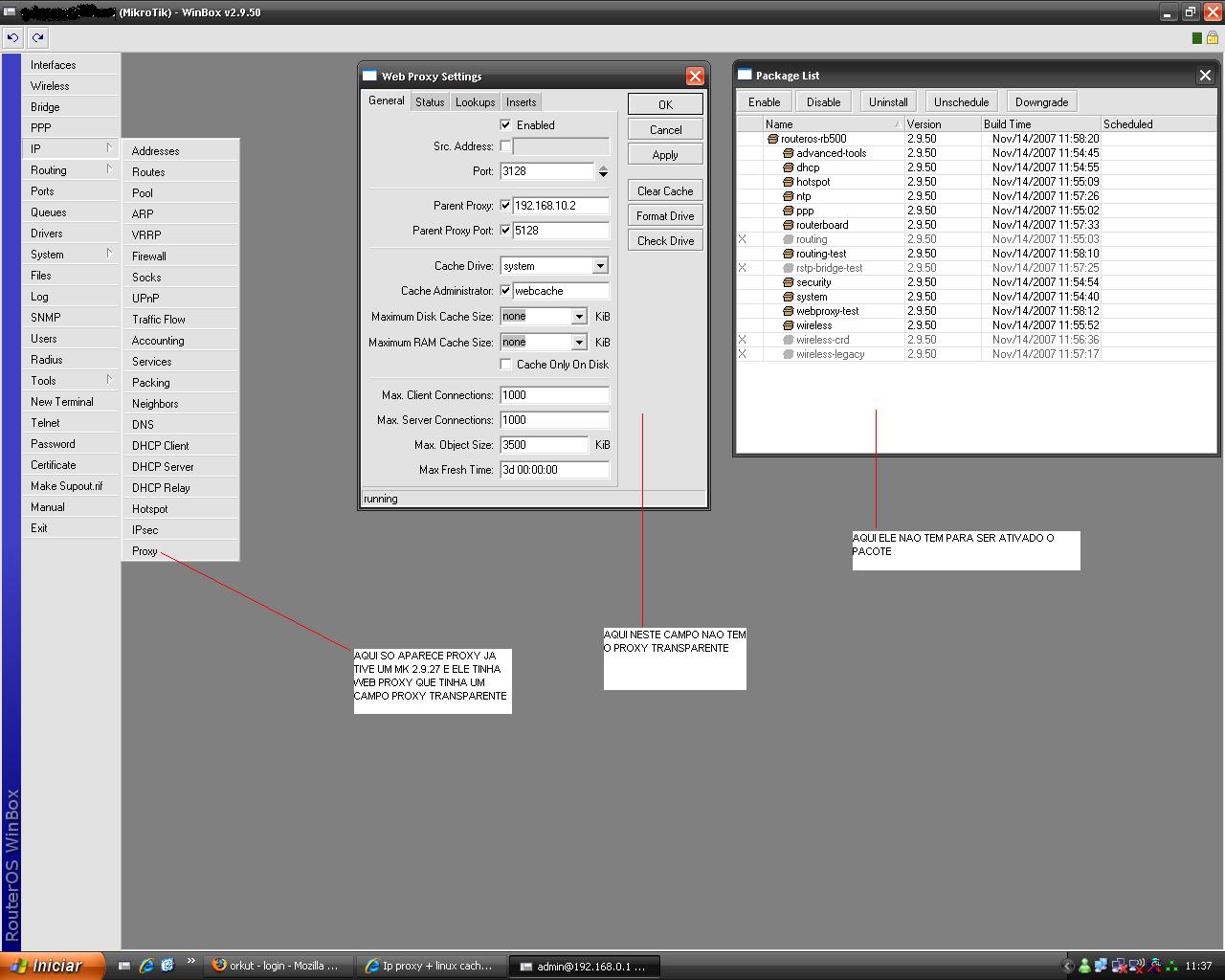 a routerboard tem 3 lan a lan1 esta recebedo o link do modem a lan2 e lan3 esta enviando para os clientes e um cartao minipci atheros r52 esta enviando tambem para os cliente junto a uma antena hiperlink 90º. Ai surge a minha duvida como faço para colocar o linux em paralelo por umas dessas lan e como configurar o ip proxy sendo que o meu mikrotik não tem web proxy. Agradeço e muito a ajuda se possivel.