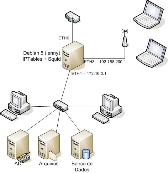 Tenho uma rede conforme o anexo. Até o momento o Debian ta fazendo o serviço de firewall e proxy entre eth0 e eth1. Tudo certinho. Não tem DHCP nem DNS nele.