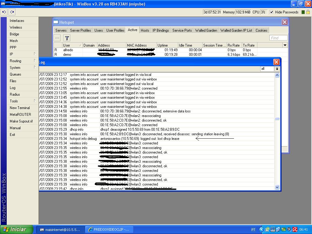 Segue em anexo a tela de log do mikrotik, a versão é a 3.28 e percebir que alguns clientes, nao todos ficam como "connected, reassociating, disconnected, ok" de 15 conectados apenas 3 ou 4 ficam assim, eles navegam normal mas pra mim fica essas mensagens. Pode ser virus nos clientes???