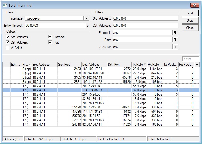 Ah, o cliente não ta furando o controle de banda, agora verificando as conexões marcadas deste cliente, apenas 1 tcp de entrada e 1 de saída, algumas marcadas como "warez" como saída e um monte de conexões udp como "Outras Conexões UDP".