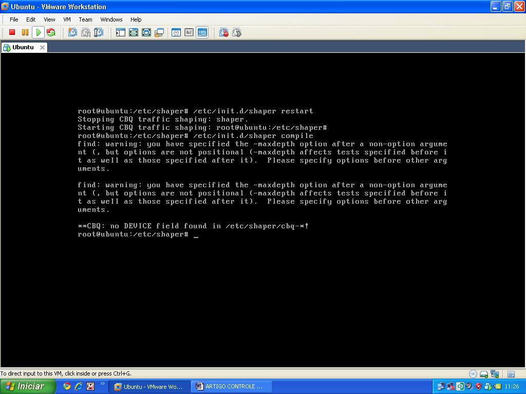 Pessoal estou fazendo um teste usando ubuntu 8.04 ubuntu no vmware estou tentando fazer controle de banda usando cbq eo pacote shaper mas está dando alguns mas mesmo assim consigo start o serviço.Porém não está limitando a taxa de download.