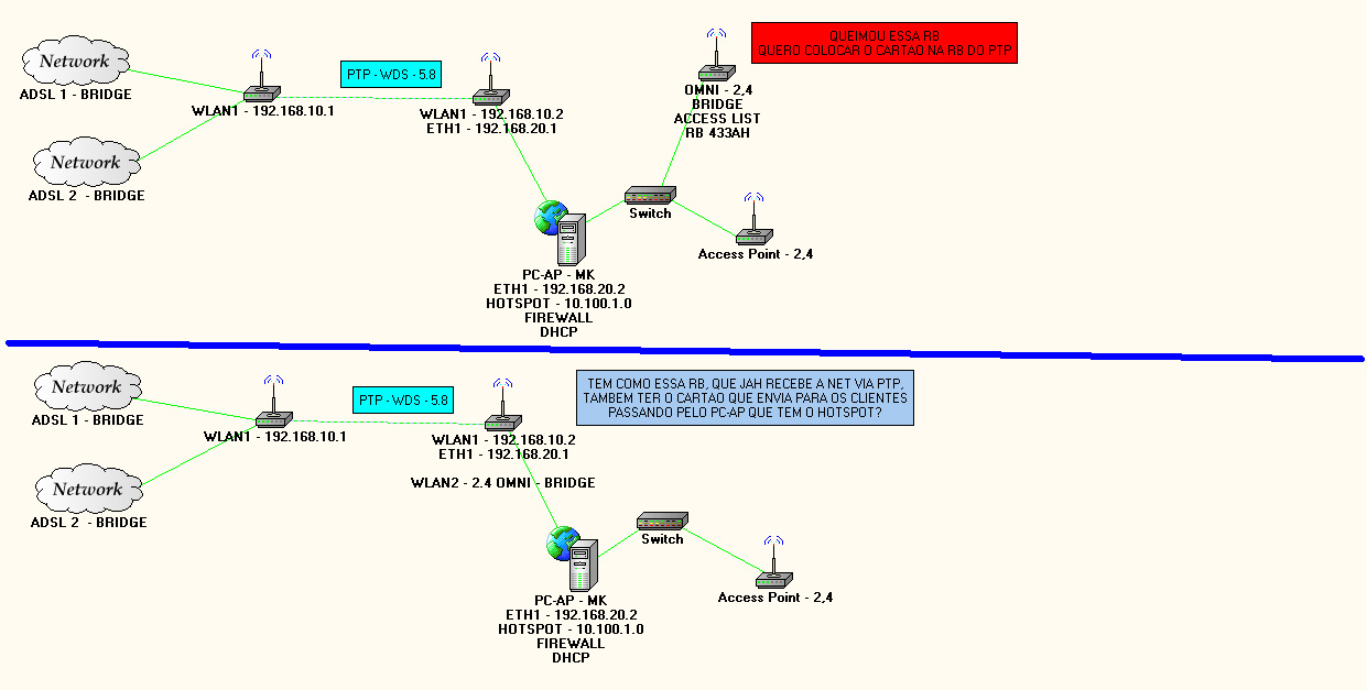 se eu colocar dois cartoes numa rb, sendo que, um cartao recebe a net via wds num ptp e envia via cabo para o pc-ap que tem o hotspot ativo..