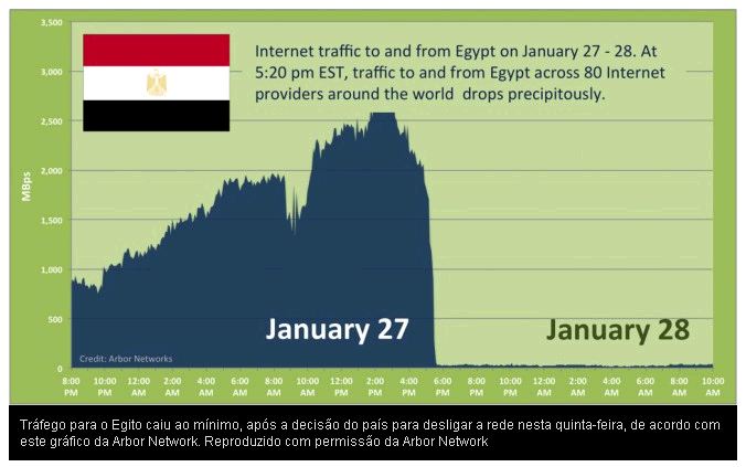 Os crescentes manifestos no Egito contra o atual regime de governo teve efeito colateral na fruição de internet naquele país.. Os provedores foram obrigados cessarem suas operações por tempo indeterminado desde o dia 28 de Janeiro de 2011. Veja o gráfico: