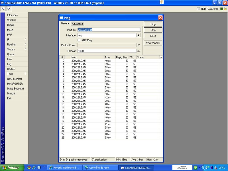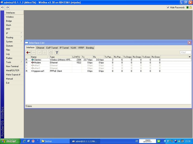 Padrão Mikrotik. Modem em bridge, routerboard discando, enviando wireless roteada