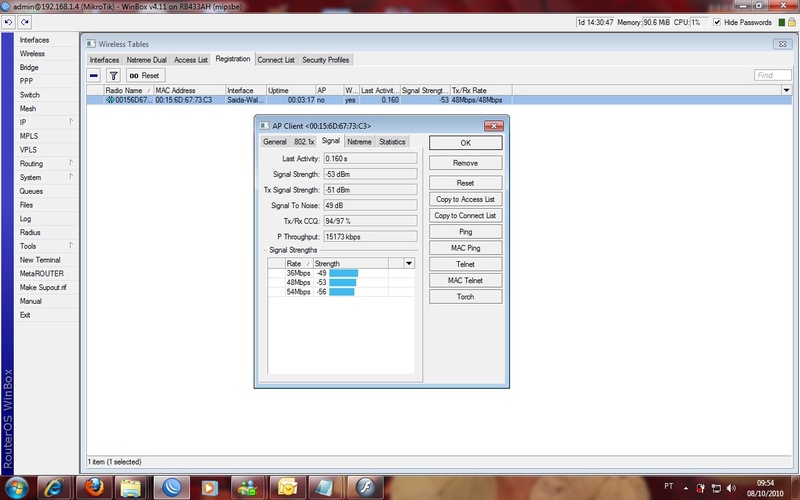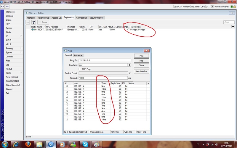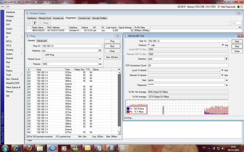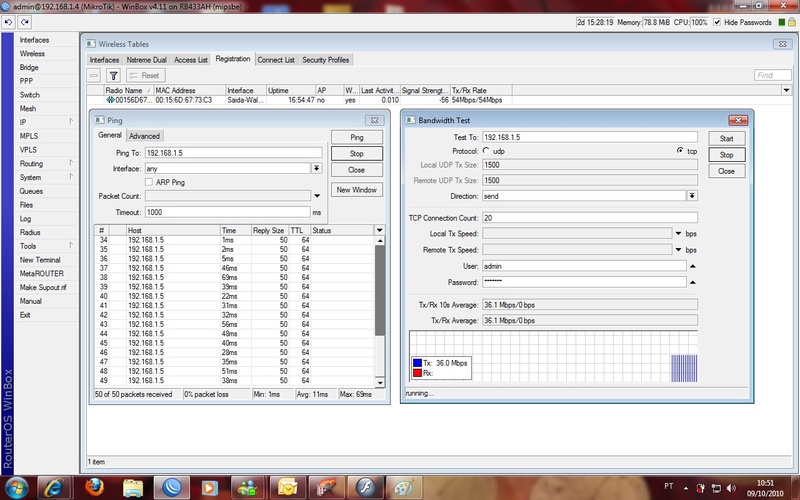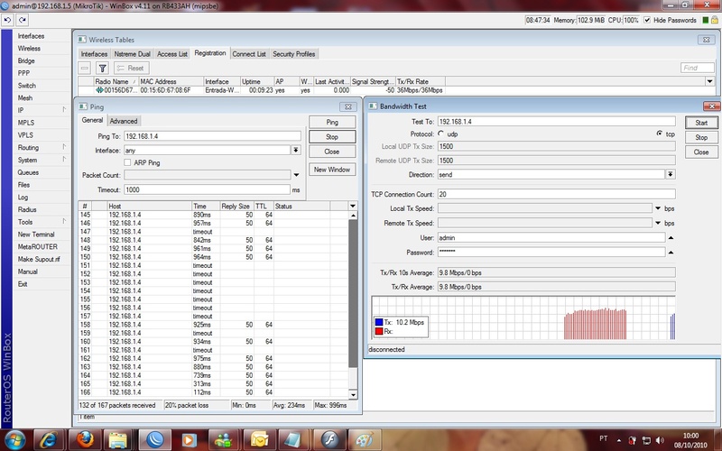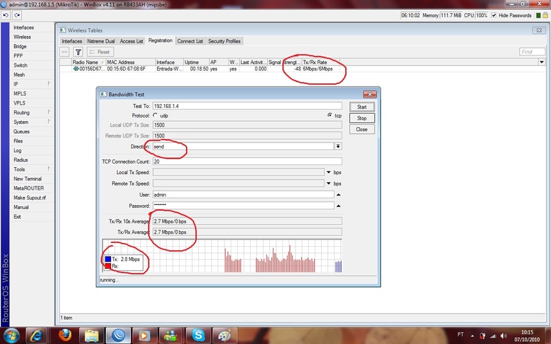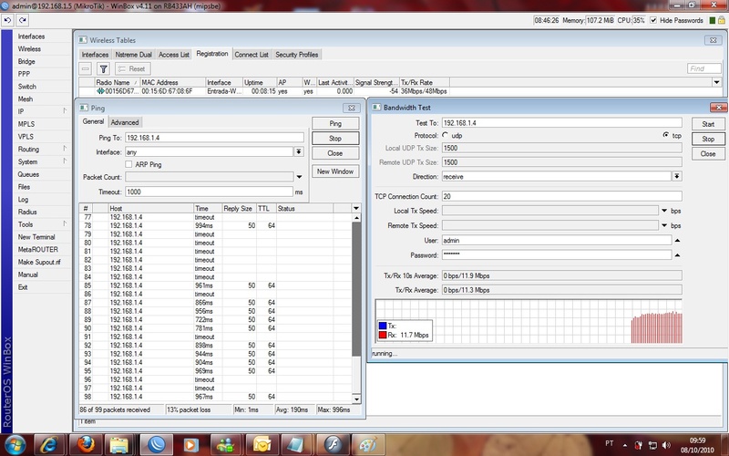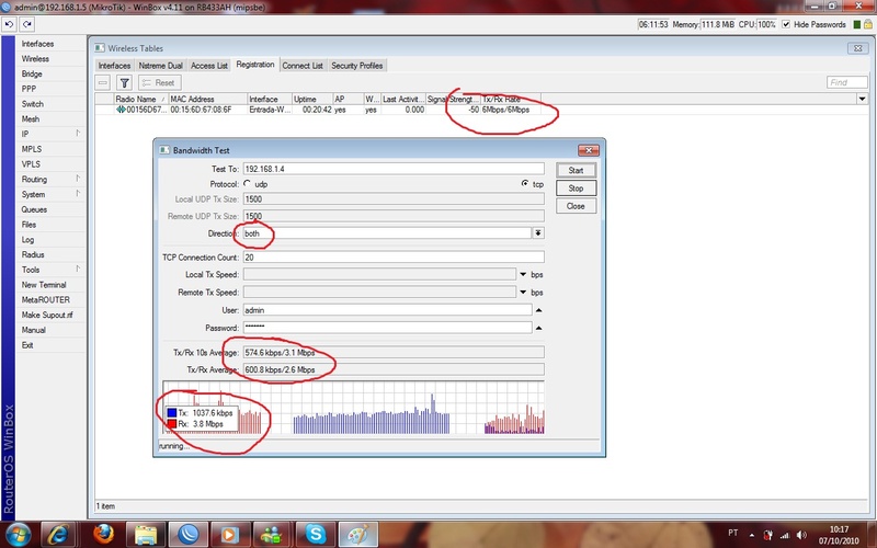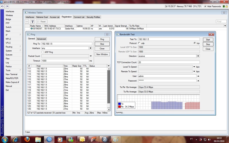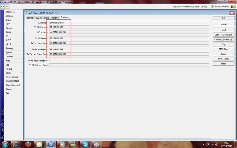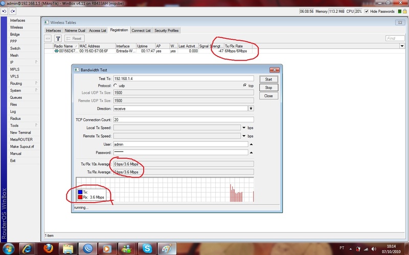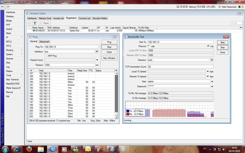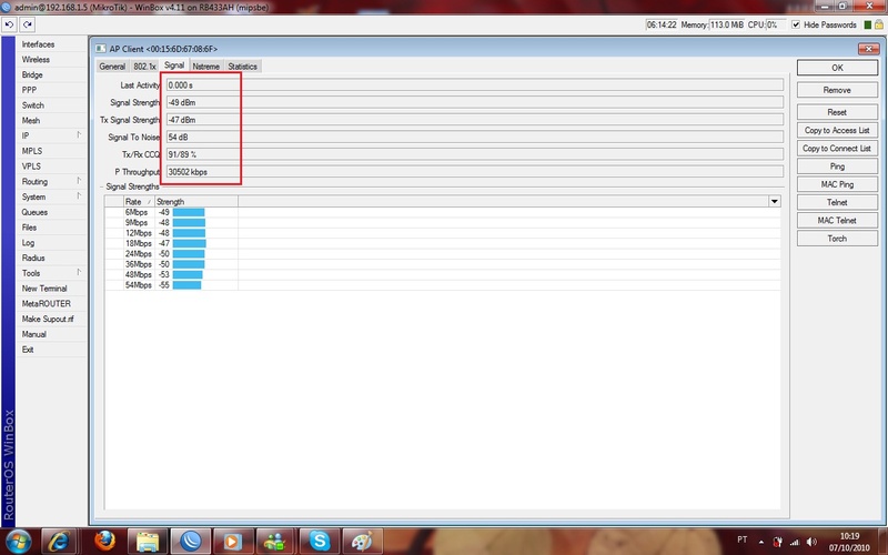 Com diversos testes que já fiz não obite êxito o Maximo que consegui atingir foi 10mb de up ou down quando coloco up e down ao mesmo tempo o não passa de 2mb. Pior que isso e quando eu tenho um down ou up o tx/rx caiu muito chega até 6/6 o o sinal fica oscilando muito entre -47 até -68 e a transferência fica muito ruim quase derruba o link quando não tem nada de transferência meu sinal fico entre -50 a -55 e o tx/rx em 54/54. Como eu já mostrei na figura acima meu Signal e meu Statics tbm esta oscilando muito