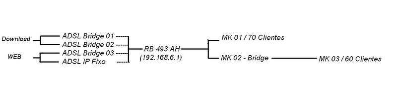 4 Links ADSL de 2mb cada, sendo 3-Brige e 1-IP Fixo entram em 1 RB 493 AH. Pretendo fazer um balanceamento deixando 2 links para download e 2 para navegação e todos os clientes vao usar o mesmo gateway - 192.168.6.1.