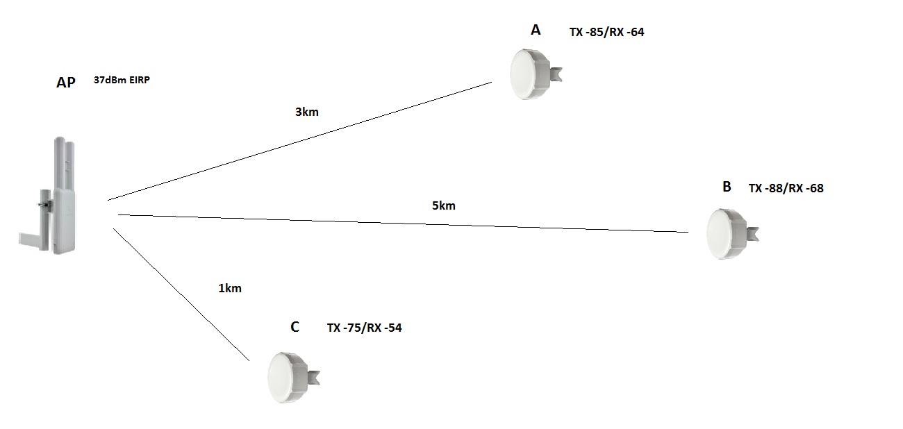 Essas contas foram para demonstrar que o sinal recebido nas estações (RX) é definido por 3 fatores: Potência EIRP do AP, perda no espaço livre e ganho da antena da estação. E o valor do sinal recebido pelo AP a partir das estações (TX na estação) é definido igualmente pelo EIRP da estação, perda no espaço livre e ganho da antena do AP.