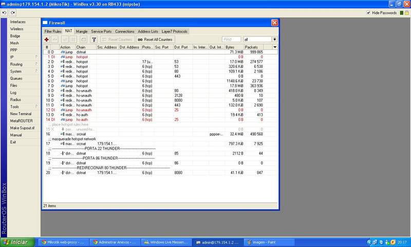 Pessoal, bom dia ja olhei varias vezes para o video que ensina a instalar e configurar o thunder 6 mais não consigo direcionar na Mikrotik para o thunder fazer cache, ja fiz de tudo to ate agora sem conseguir ja vi varios posts e nada, eu tava com o thunder 3.1 instalei o thunder 6 tudo do zero, mais não consigo finalizar a configuração do thunderview 2 e se as regras no firewall, filters rules, Nat e Mangle mudam??