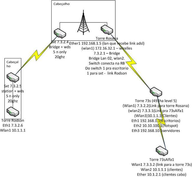 achei que fosse alguma coisa na segunda torre pq tenho nela hotspot (abaixo vou mandar o diagrama de rede completo) hoje expandi a rede configurei dois sxt da mikrotik. e deu a mesma coisa. ja fiz tudo que sabia estou desconfiado que seja a camada de ip que uso, mas não tenho certeza. bem acho que com o fluxo grama fica mais fácil de entender.