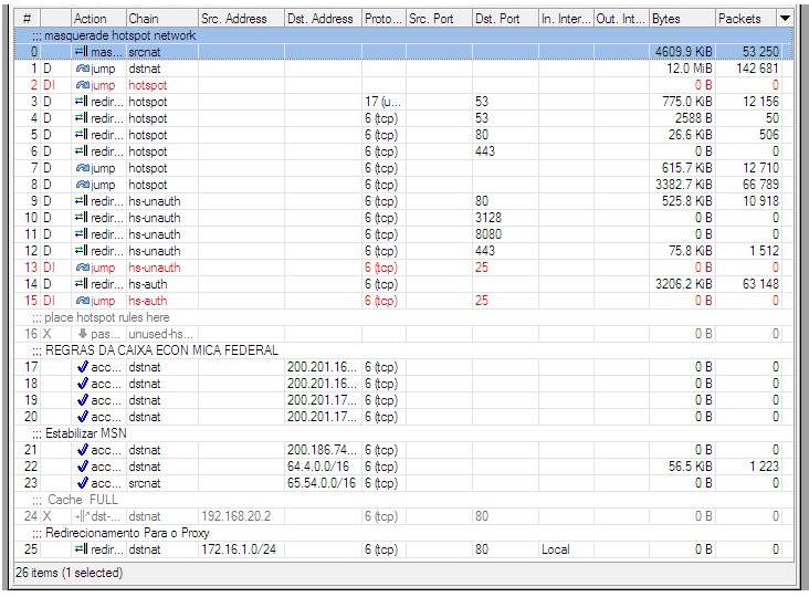 Pode tentar desativar seu hotspot e proxy transparente e apagar todas regras que estejam em NAT e Filter.