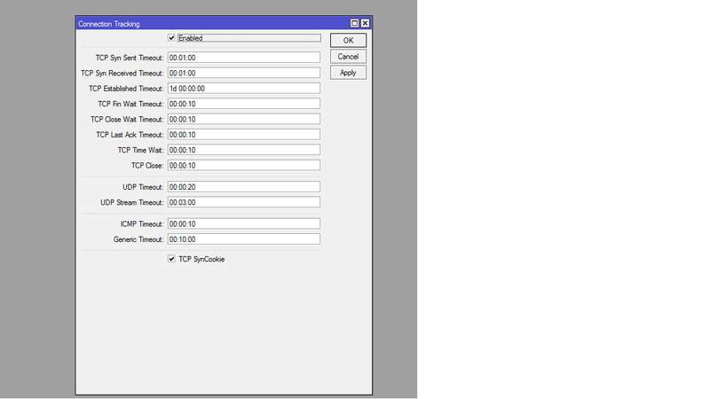 Por acaso alguém já fez algum tuning no Connection Tracking do Mikrotik? Por exemplo, "TCP Established Timeout" por padrão é um 1 dia, como vou saber que esse valor é o mais adequado para o ambiente? Existe uma fórmula para calcular esse e outros valores para melhorar a performance do filtro? E quais mecanismos de segurança que vem sendo usado para evitar que o número máximo de conexões (max-entries) seja excedido causando um provável DoS?