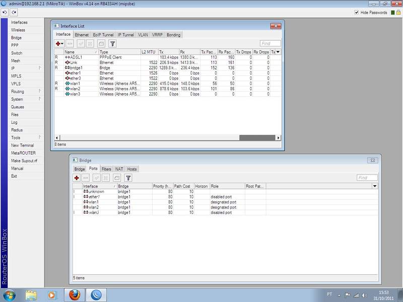 O link (por enquanto um ADSL 10Mega, já estou levantando um bom preço para dedicado) entra na RB, que está ligada a um modem, naturalmente em bridge. Os 3 cartões estão configurados em uma única bridge (algum problema nisso?).