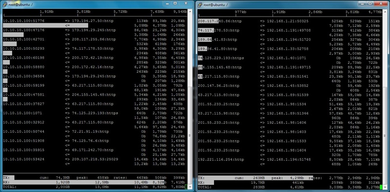 Como vocês podem ver, a tela do lado esquerdo está com o link de internet (ETH0 com IP 10.10.10.100 atrás de um roteador), e a tela do lado esquerdo está a rede local (ETH1 com os clientes 192.168.1.0).
