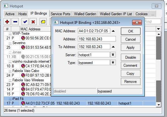 O meu problema são os computadores da administração, todos eles estão com IP + MAC configurados no DHCP e novamente IP + MAC no IP Bindings do hotspot com Bypassed.