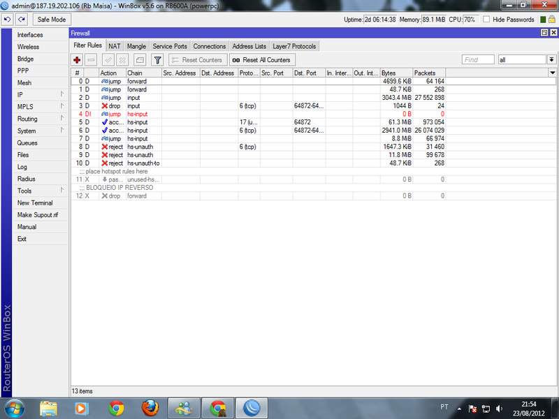 Ola gente quero uma ajuda de vcs eu tenho uma R600A uso hotspot o que ta acontecendo é que qndo tem 42 ou mais clientes on-line simultaneamente a cpu dela vai para 90-97% e os meus clientes estao reclamando de lentidão no sistema comentei com um amigo aqui ele falou que poderia ser alguma regra no firewall gostaria que alguém me desse uma luz .
