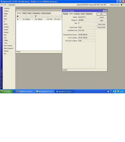Eu nao uso o web proxy segue a imagem de como esta meu web proxy.os valores receiver from servers e send to clientes ficam mudando direto e mais uma coisa baixei o aquivo do site mikrotik descompactei ai ficou um monte de arquivos na pasta eu coloco a pasta toda duma vez ou arquivo por arquivo ?Se poder me