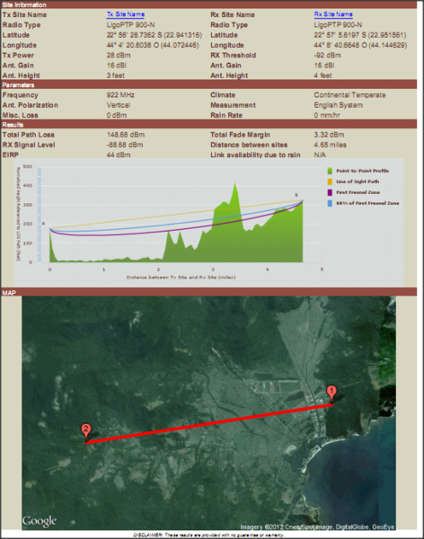 2º poderia analisar essas informaçãoes do lingo wave para saber se eu vou ter sucesso na instalação segue o anexo. o morro da imagem ta muito alto mais ele é mais suavel na realidade e tem uns 5km de baixada plana só um morro no meio e a recptora vai ficar no morro mais baixo atrás desse que tem no meio do link.