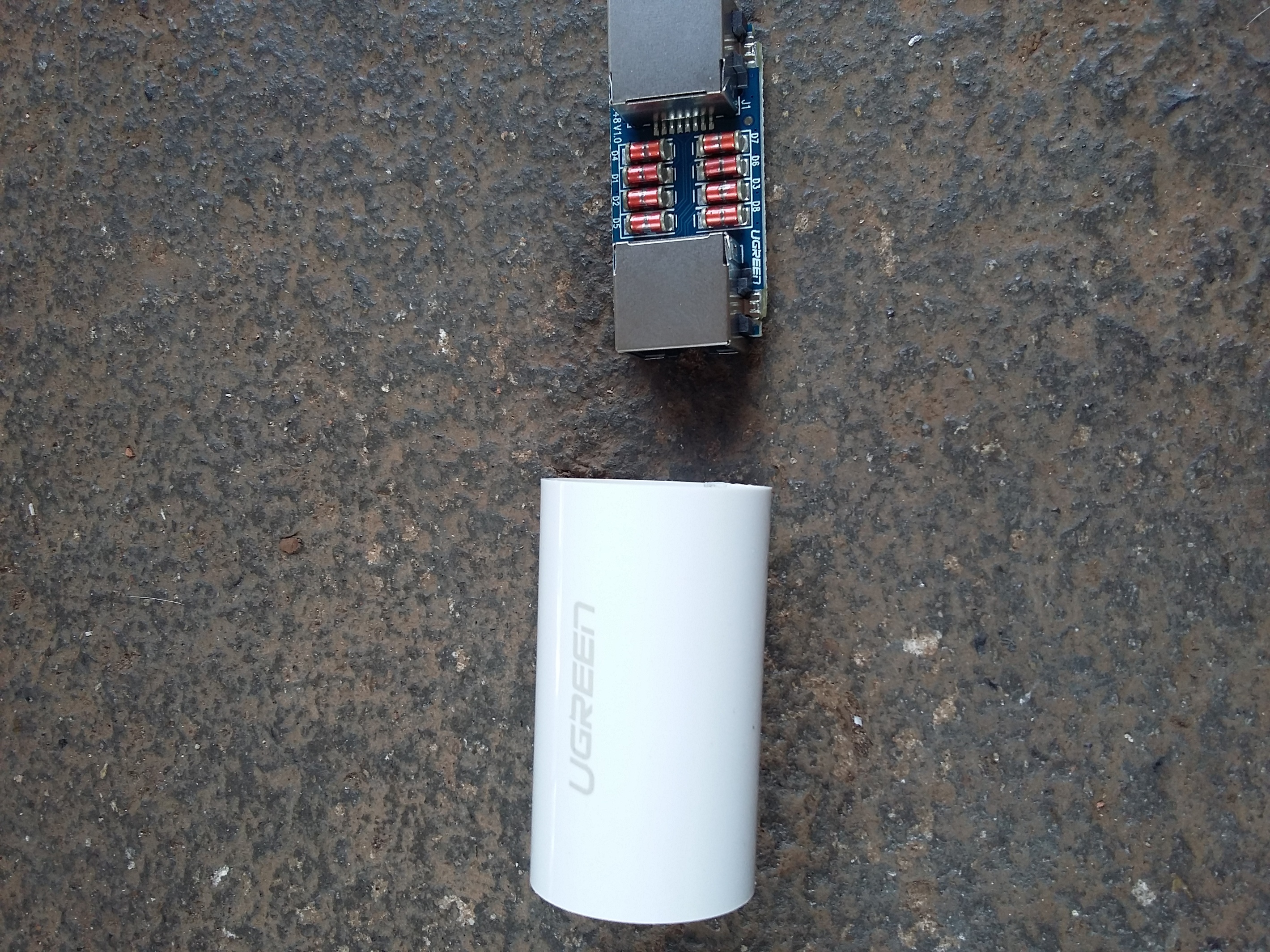 O vendedor do ML até fez algo raro, mostrou foto de dentro, mas não dá pra ver os componentes do outro lado. Mas... curiosamente os menores centelhadores a gás são pra 75V, então só posso imaginar que ele tem apenas varistor na linha de dados (Igual os da Ubiquiti de US$ 13). E existe no mercado varistor de exatos 93V (Tensão que entram em curto, mas podem operar normal com 48V), então a proteção do POE parece ser apenas varistor.