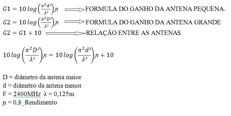 Para que uma antena com diâmetro d=90cm fique com 10 dBi à mais de ganho, é necessário que seu diâmetro passe a ser 0,90x4,2= 3,7m.
