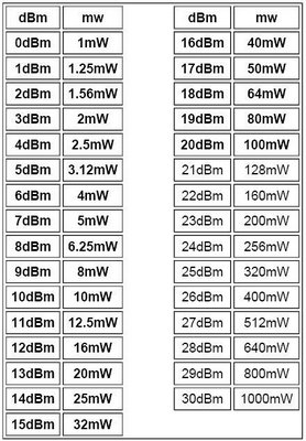- 6dBm = 4mW / 9dBm = 8mW / 12dBm = 16mW / 15dBm = 32mW / 18dBm = 64mW