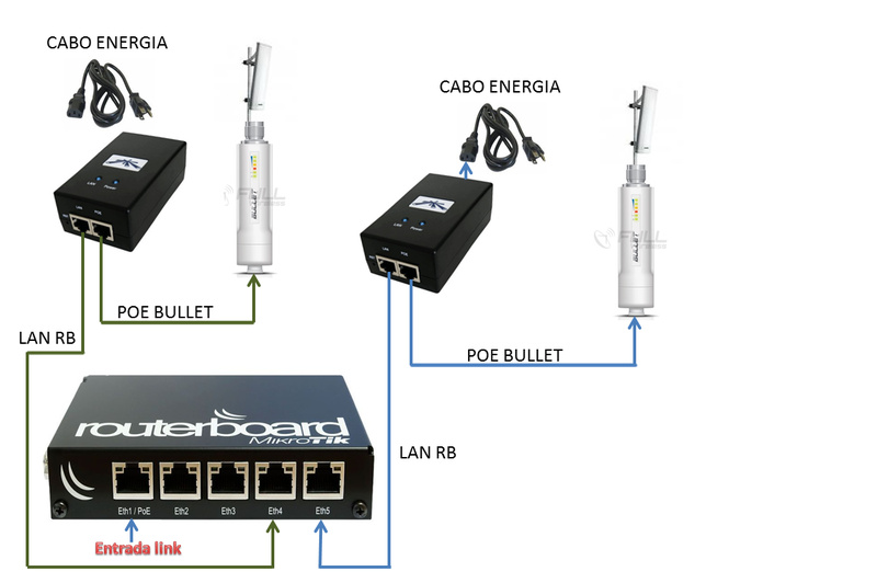 Bom dia amigos do forum estou montanto uma rede wireless em uma marina e estou com a seguinte dúvida. Existe algum problema em conectar o bullet 2 HP nas saidas LAN do RB/450g sendo que o bullet poe, alguem já fez isso? Os 2 bullet estarão conectados a 2 paineis setoriais hyperlink de 20Bdi, e os 2 bullet estarão como bridge uma vez que a função de AP será feita pelo RB/450g que tb será um hotspot. A minha dúvida é se devido ao POE eu posso ligar os 2 Bullet diretamente no RB ou se terá a necessidade de inserir um switch entre os equipamentos?