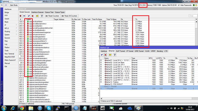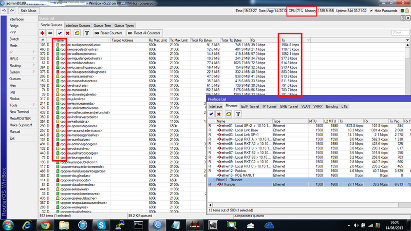 Entendi o que você quis dizer, porém, os 480 clientes é no PPPoe e mais uns 40 com ipXmac (520 clientes total) já no pico, sem Thunder processamento fica abaixo de 60% com Thunder sobe pra mais de 70%, tudo bem, isso é outra historia, creio que não seja isso o problema.