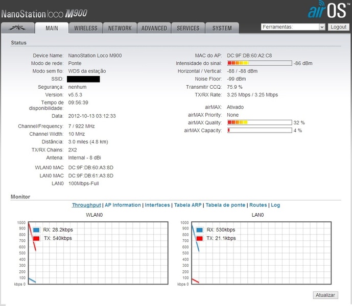 Sou iniciante no assunto e aqui no fórum. Tive a necessidade de enviar internet de casa pro meu laboratório de eletrônica que fica a 4.6km de distância, porém tem um morro no caminho de + ou - 20 metros impedindo a visada. Após pesquisas na net e aqui no fórum decidi arriscar esse link e comprei dois nanostation loco m900. Ontem eu os instalei sem antenas externas e consegui fechar porém com pouco sinal: -87 dbm e configurado a 922Mhz e 10Mhz conforme segue as imagens. Consegui 1Mbps de down e 1Mbps de up, o que já eh bom, porém, gostaria de saber com vocês se consigo aumentar este sinal pra consequentemente aumentar o Download, colocando as antenas externas, qual antena comprar e onde comprar ou até mudando alguma configuração nos nanos. Se conseguir 5Mbps estará de bom tamanho. O que vocês me recomendam??