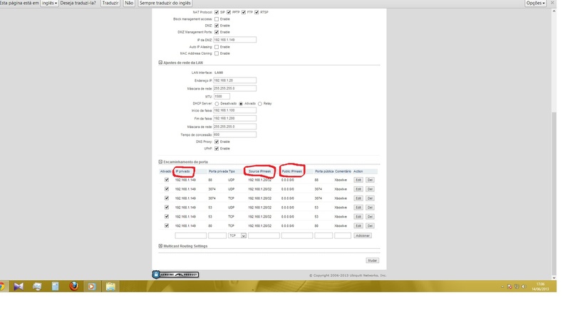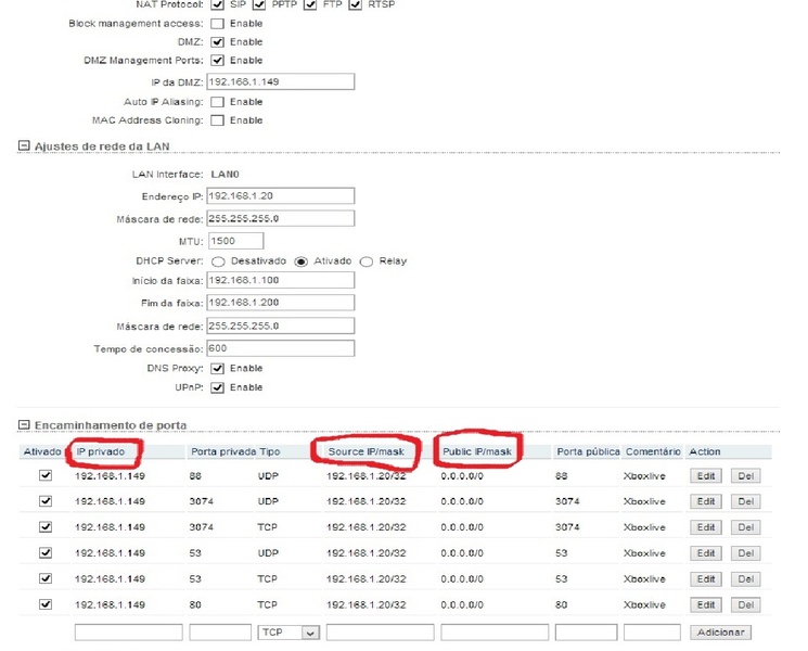 SOLUÇÃO: NO IP PRIVADO VOCÊ COLOCA O IP DO SEU XBOX NO CASO O MEU ERA 192.168.148 E NÃO 192.168.149, CONSEGUI SABER ENTRANDO NAS CONFIGURAÇÕES DE REDE DO CONSOLE, FEITO ISSO A PARTE QUE TEM SOURCE IP É PARA DEIXAR EM BARNCO E A PARTE DO IP PULBIC É PARA DEIXAR EM BRANCO TAMBÉM, O RESTANTE É PARA DEIXAR COMO ESTÁ NA FOTO QUE SÃO AS PORTAS CORRETAS. AH SÓ LEMBRANDO NÃO ESQUEÇAM DE ATIVAR O DMZ COM O IP DO CONSOLE QUE É O MESMO QUE VOCÊS IRAM COLOCAR NO IP PRIVADO NA HORA DE CONFIGURAR AS PORTAS!